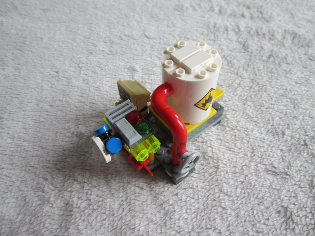 Du coté du contenu, on a le strict minimum avec deux figurines et un élément de décor. C’est dans la plus pure tradition de Lego. La réalisation est très correcte, j’aime bien le jet-pack du Joker et la bombe est bien réussie. La cuve est très simple, mais ça permet de récupérer des éléments de canalisation qui pourront resservir dans beaucoup de MOCs.
