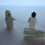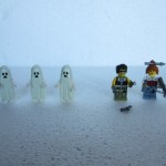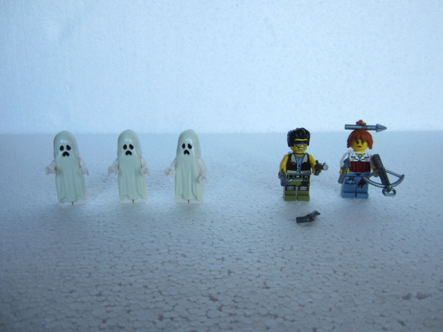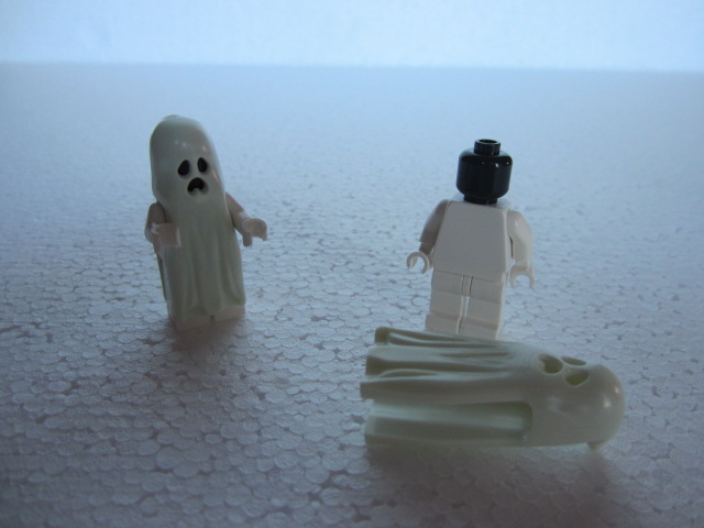 Les fantômes sont constitués d’une minifig blanche à tête noire avec une pièces phosphorescente. Ils sont super !