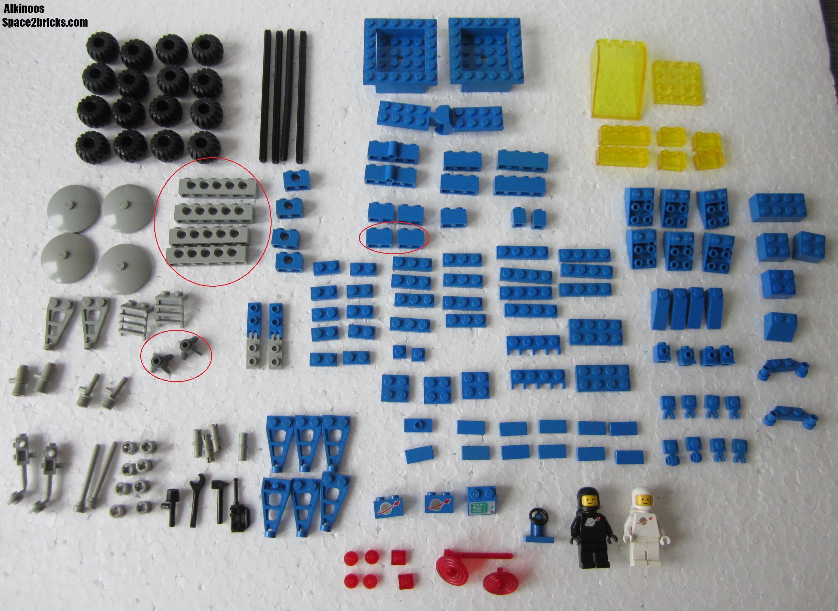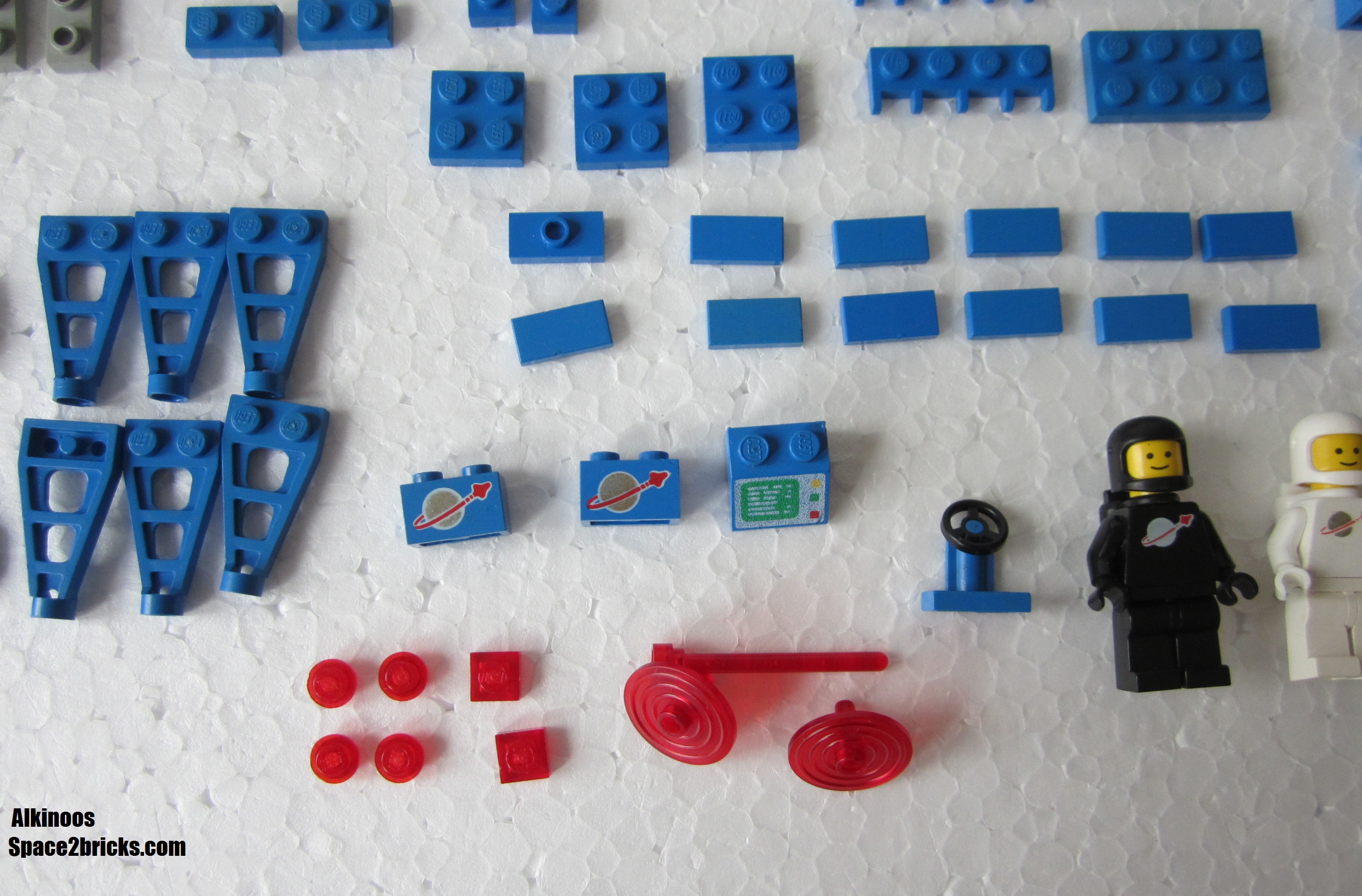 L’inventaire du set. Il n’est pas 100% complet. Les 4 pièces technic sont normalement bleues. Les deux réacteurs doivent être gris clair (old gray). Pour finir, il manque 2 pièces sérigraphiées (radiateurs).