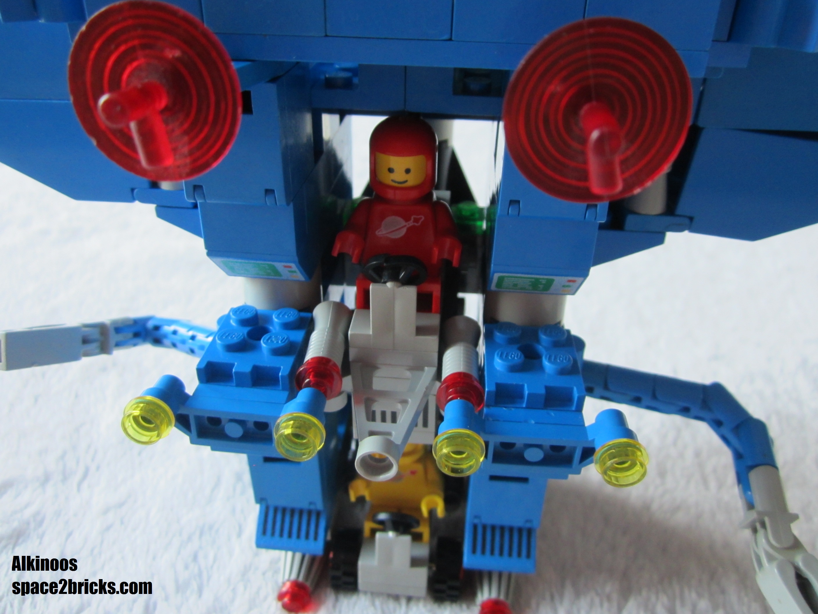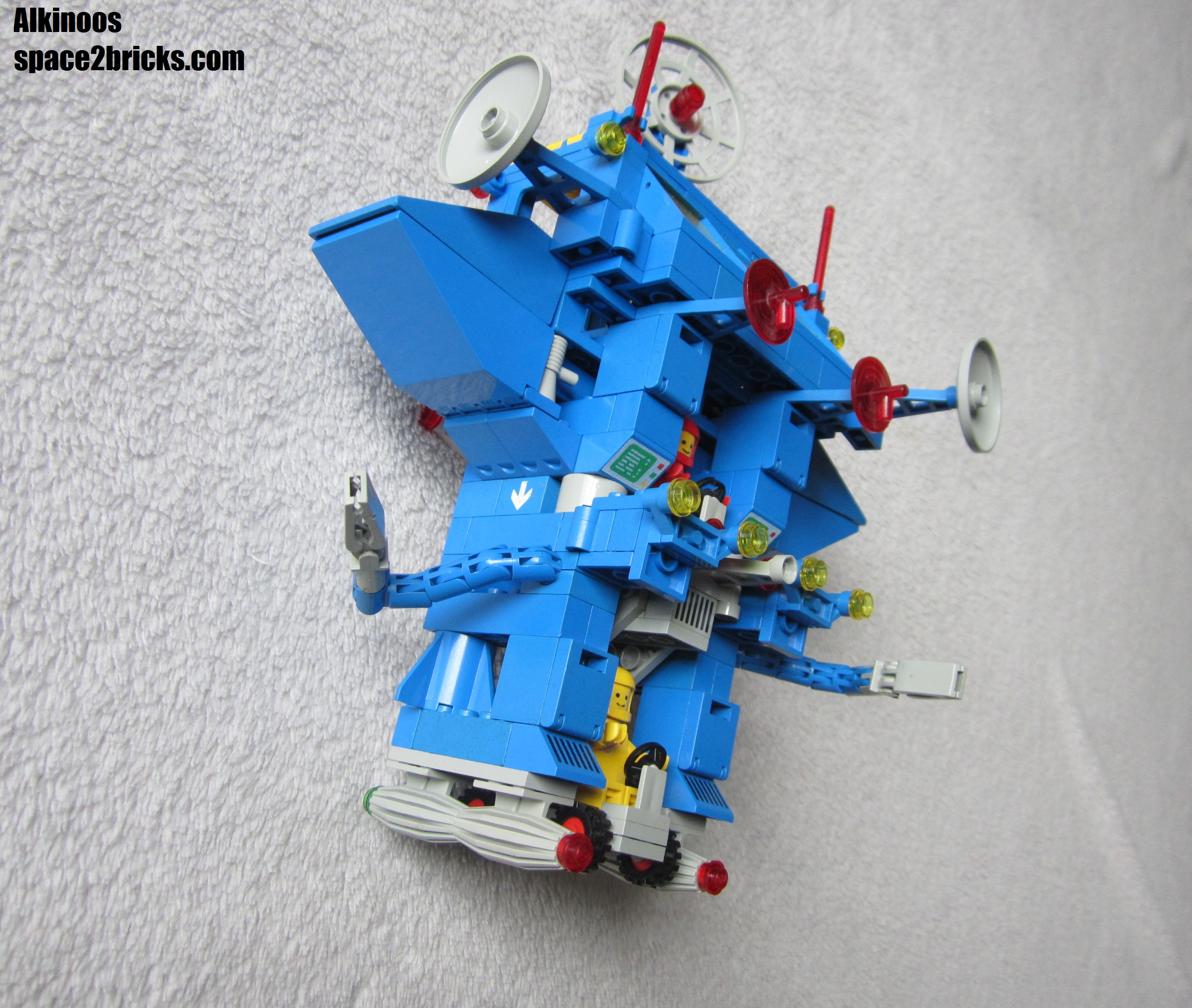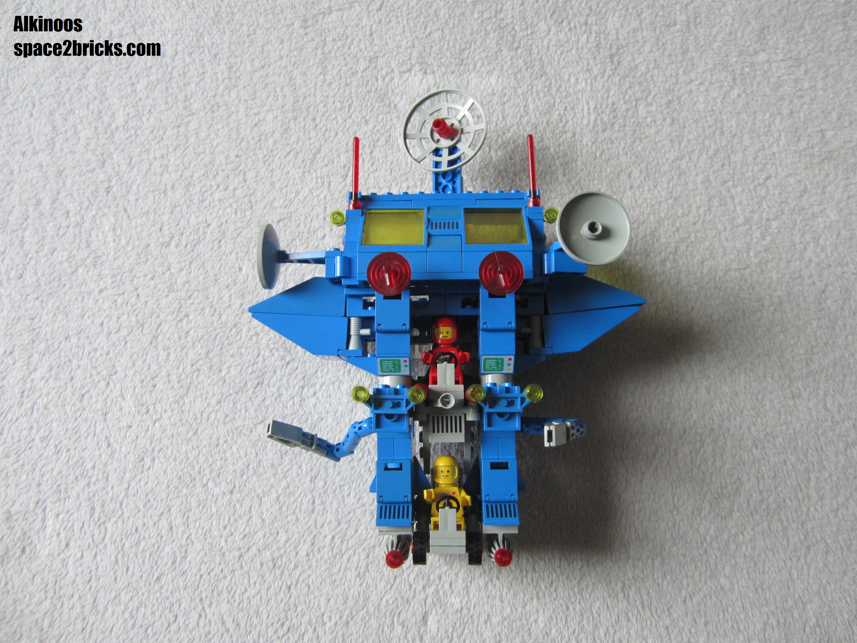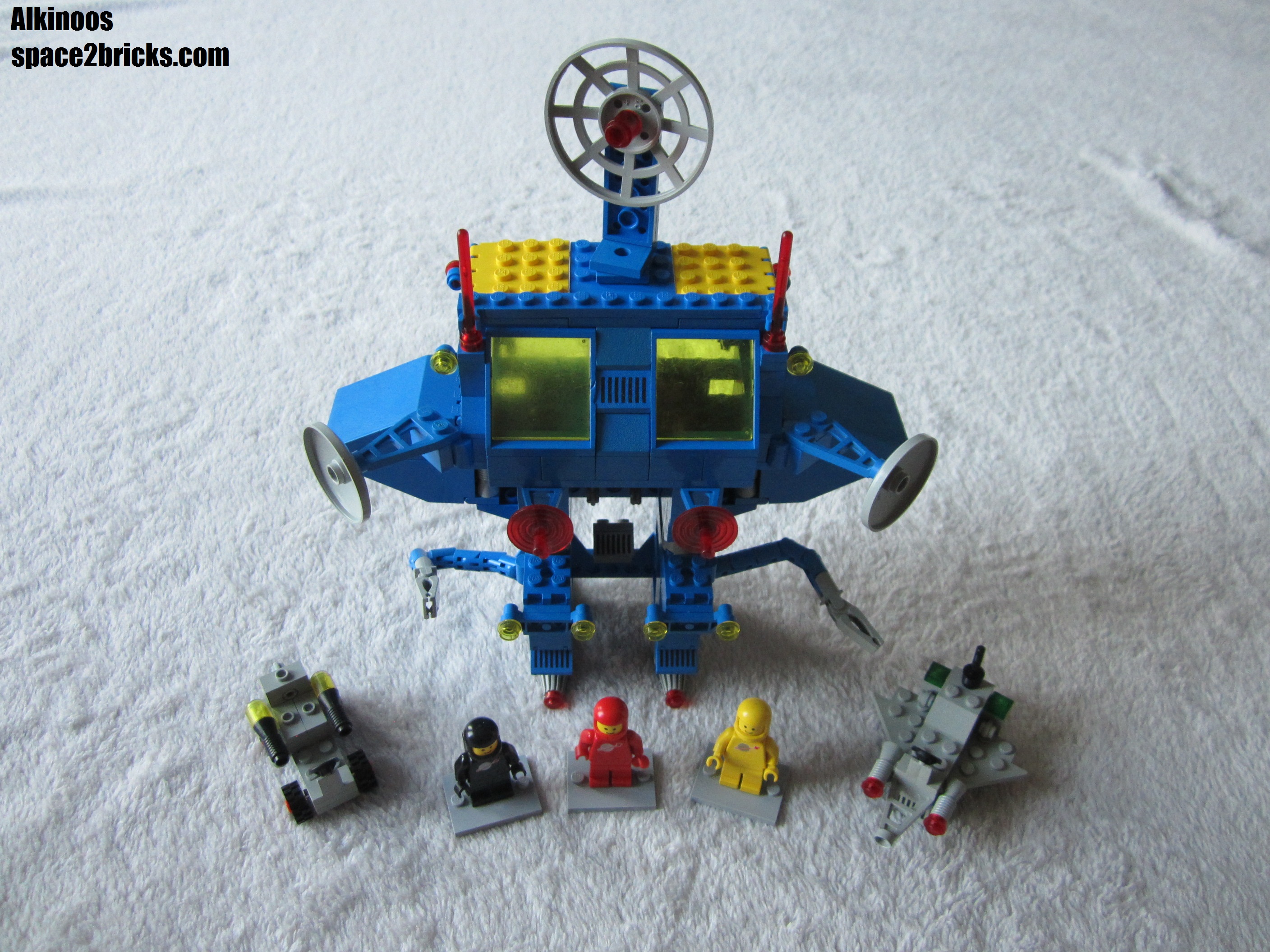 J’aime bien l’aspect général avec cette base mobile au allures de robot géant. Il y a plein de bonnes idées dans le set Lego Space 6951: comme le système d’attache des véhicules très malins et robuste qui permet de transporter le tout sans rien perdre. On a d’autres petits trucs comme des boîtes de rangement, des bras mécaniques et de multiples radars. Un point remarquable, c’est qu’il y a pas mal de pièces sérigraphiées qui donnent un look moins bleu uniforme et donc plus cool. 3 figurines sont incluses, c’est sympa et c’est bien le minimum pour profiter pleinement de l’ensemble.