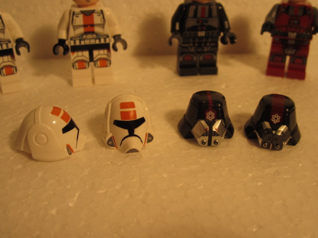C’est un bon « battle pack ». Deux soldats dans chaque camp, comme ça pas de jaloux. Les soldats sith ne sont pas complètement nouveaux, car déjà sortis en 2012. Il y a une évolution avec la sériegraphie sur les jambes et un nouveau jeu de couleurs. Du coté de la République, on découvre de nouveaux casques. Ca fait de la nouveauté dans l’univers SW. Autant les casques sith ressemblent un peu à celui de Dark Vador, autant ceux de la République ne ressemblent pas du tout à ceux des clones ou à ceux de stormtroopers.