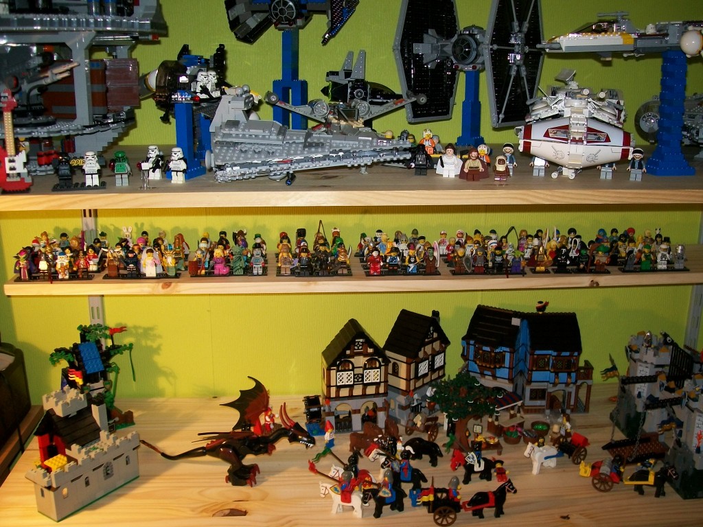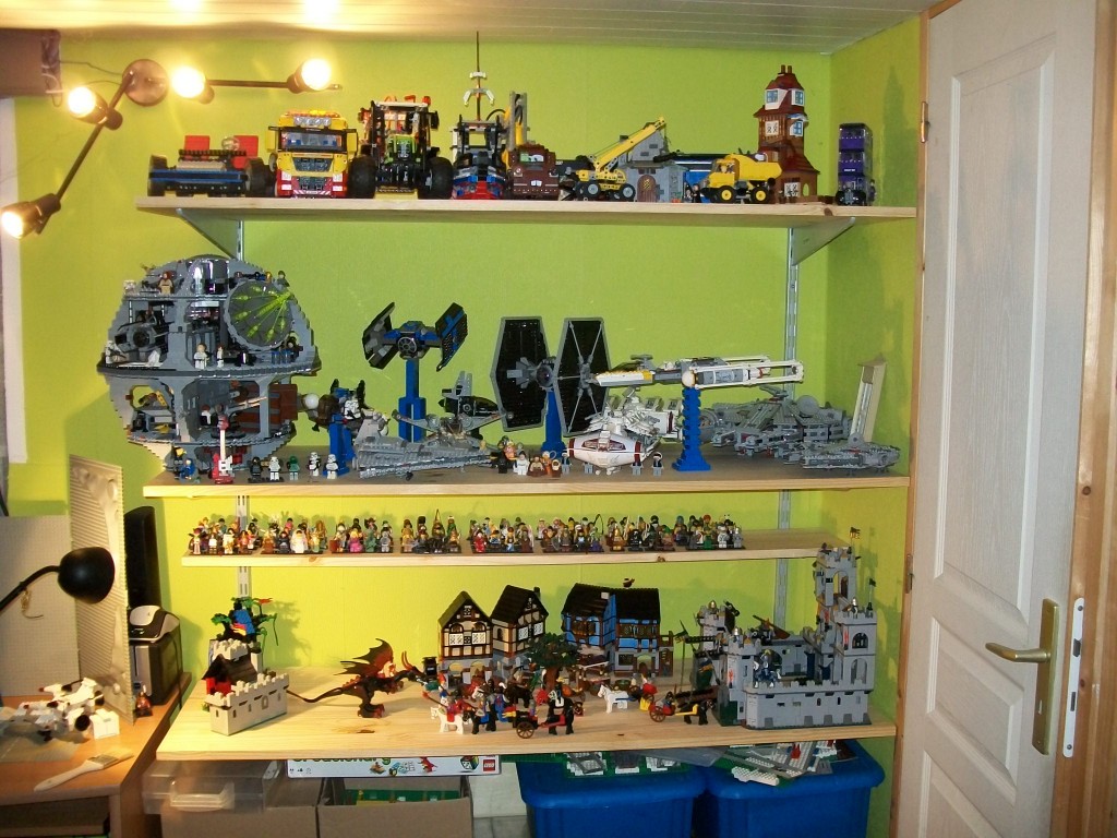 Les étagères sur l’autre mur: Space et Blacktron II en haut. La bataille de Hoth au milieu. Harry Potter et du médiéval en bas.
